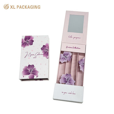 The drawer cosmetic box outside is a sleeve structure, box facial is glitter techque which meet client lipstick product feature--shinny. Inner drawer box is a flat open box. The drawer has paper divider tray to seperate pack different color lipstick product. And in the flap part, we made a mirror for the customer convenient in make up.