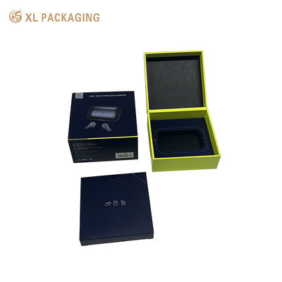 Inside the earphone paper box, you will discover a 2-piece set flip box, with the inner top cover in black and the earphone paper gift box lower cover featuring black EVA foam with blue and white printed paper on surface for holding the earphones. This earphone box design is not only aesthetically pleasing but also complements the overall design style of the paper box sleeve, creating a simple yet non-monotonous look for the entire earphone gift box packaging.