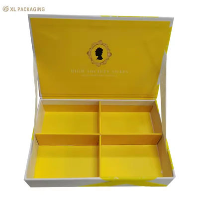 Elevate your beauty packaging with our exquisite Cosmetic Paper Box, designed to blend elegance with functionality. This magnetic closure makeup box features a pristine white exterior adorned with a vibrant, yellow flocked design that perfectly showcases your brand logo. The eco-friendly yellow resin logo plate on the front adds a touch of modern vitality, ensuring that your packaging stands out on any shelf.