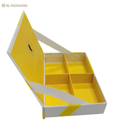When you open the cosmetic gift box, you'll discover two striking yellow ribbon pull handles that make accessing your products both easy and stylish. The interior is lined with bright yellow printing, complemented by bold black and white text, creating a vibrant contrast that highlights the contents.